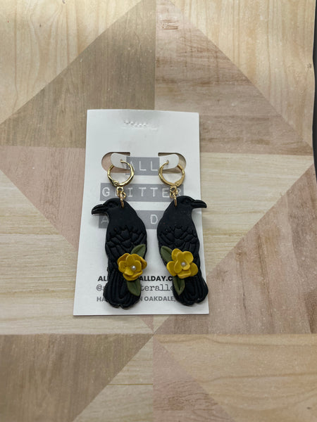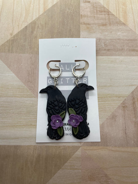 Black polymer clay raven dangle, available in 4 colors, finished on a huggy hoop in gold or silver. Modern raven design features handmade flower with pearl center.