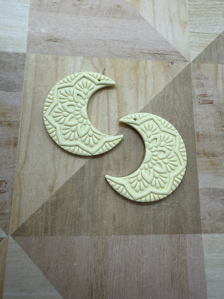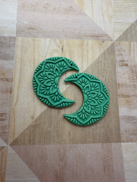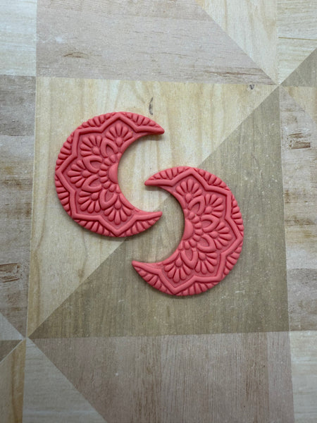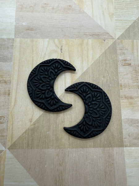 This beauty is our large moon mandala. She is buffed with a light coat of wax for a slight sheen. Available in multiple colors, and finished on a sterling silver fishhook earring, and clear flower rubber stopper.