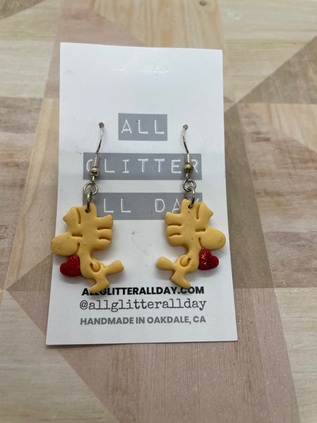 Snoopy loves his little yellow bird sidekick. These are adorable yellow bird dangles made from polymer clay, finished with a red glitter heart.